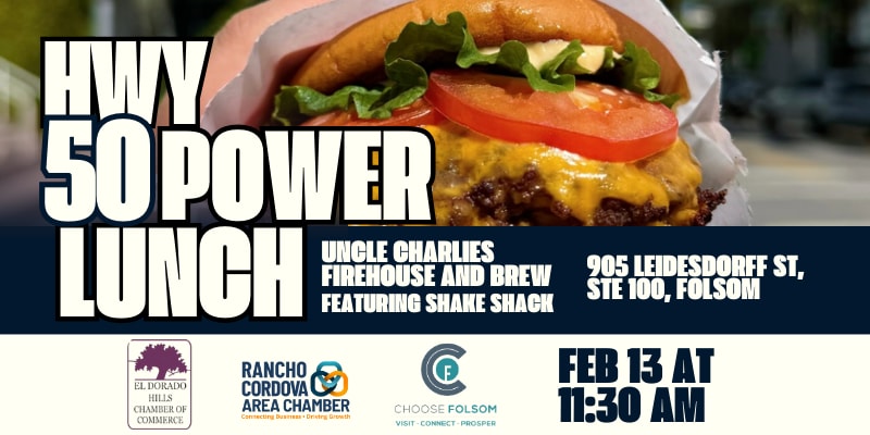 Connect with professionals from the Folsom, El Dorado Hills, Rancho Cordova, and El Dorado County Chambers of Commerce at this month's Highway 50 Corridor Power Lunch—hosted by El Dorado Hills!